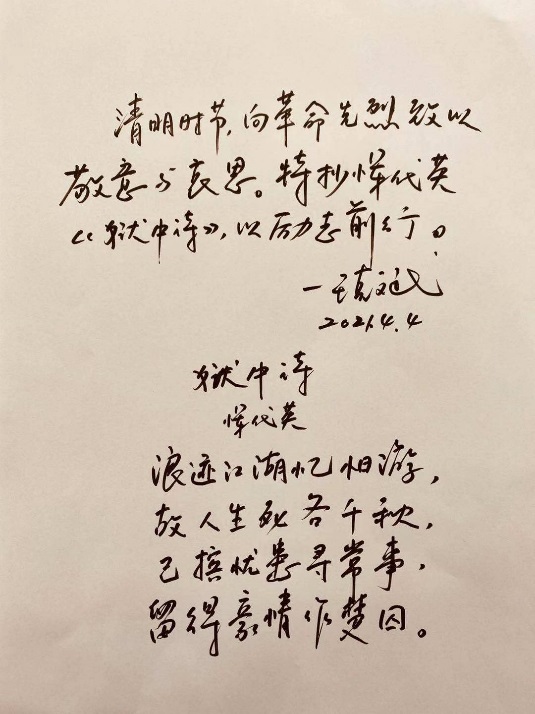 其中,镜月公司党支部和期刊中心党支部部分党员观看了龙华烈士陵园祭扫活动直播并参加在线追思英烈活动,与在直播现场祭扫的人们一起,肃立向革命烈士三鞠躬,以诵读英烈名字的方式向革命先烈致以敬意与哀思。“已摈忧患寻常事,留得豪情作楚囚……”恽代英烈士后人现场诵读了恽代英烈士的《狱中诗》,产业联合党总支书记、期刊中心党支部书记等带头挥毫抄写了这首《狱中诗》等红色诗篇,鼓舞奋进新时代的英雄精神。利用清明假期,党员们还纷纷集中自学了习近平《论中国共产党历史》等党史著作,从党的百年非凡历程中汲取继续奋进的智慧和力量。